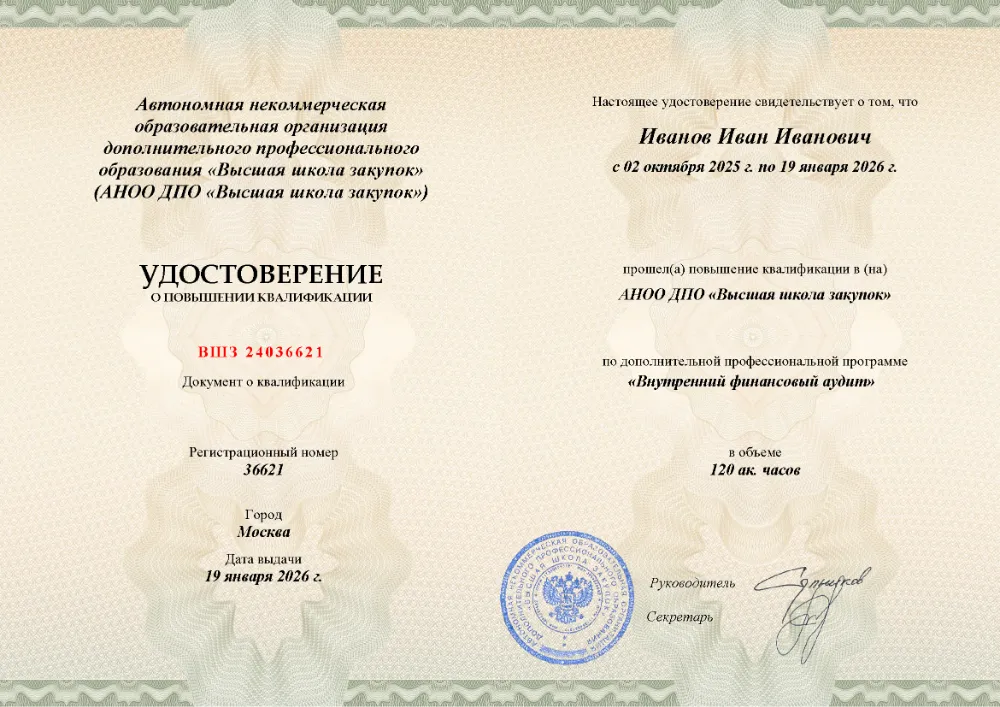 Повышение квалификации, 108 академических часов, 6 модулей: понятие, органы и стандарты внутреннего финансового контроля, планирование и организация контрольных мероприятий, процедуры оценки рисков, мониторинг и аудит в сфере закупок. Онлайн-обучение в в Екатеринбурге с итоговой аттестацией.