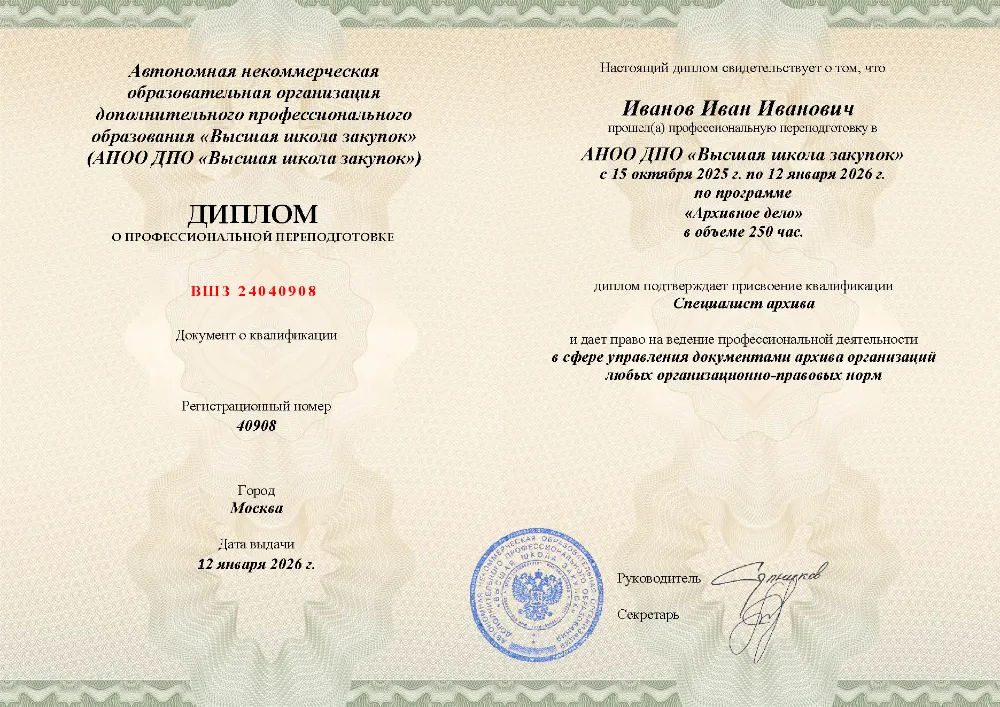 Программа профессиональной переподготовки (250 часов) для специалистов по архивному делу. Освойте правовые основы управления документами, технологии делопроизводства, оцифровку и организацию работы электронного архива с экспертизой ценности документов. Онлайн-обучение в в Екатеринбурге с итоговой аттестацией.