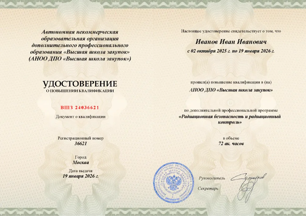 Повышение квалификации, 72 академических часа, 9 модулей: законодательное и нормативное обеспечение, дозиметрия и приборная база, лицензирование, методики радиационной защиты при эксплуатации и обслуживании установок, действия при авариях и ЧС. Онлайн-обучение в в Екатеринбурге с итоговой аттестацией.